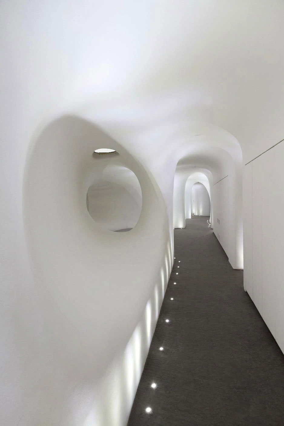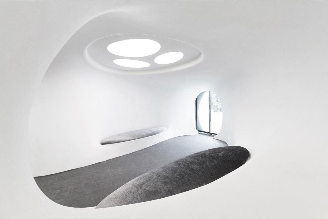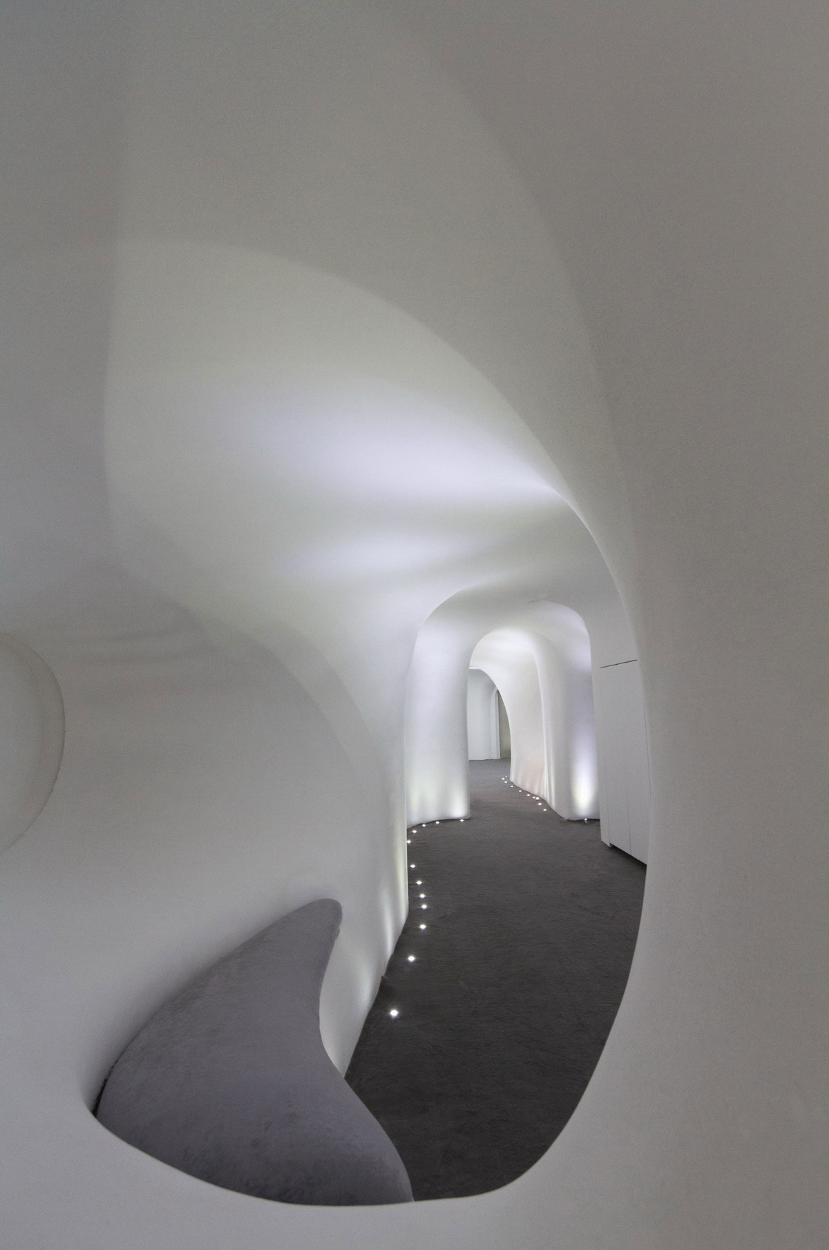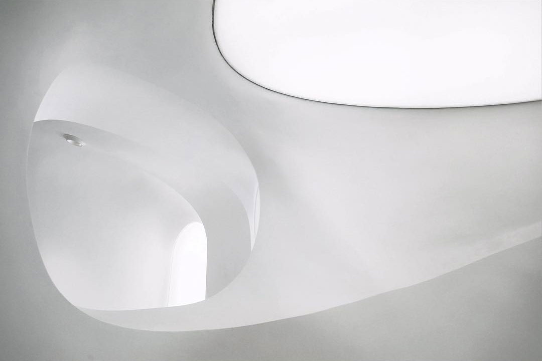 Así pues, la experiencia espacial viene determinada por la continuidad de las formas orgánicas. Los pasillos y las estancias fluyen sin ángulos rectos, mientras que las «ventanas con forma de canto rodado» enmarcan vistas espectaculares de la cordillera. El predominio del blanco, por su parte, refuerza la metáfora de la humilde nieve, que lo cubre y unifica todo al caer del cielo. En consecuencia, ya no es un edificio que ocupa un lugar, sino que parece brotar de él.