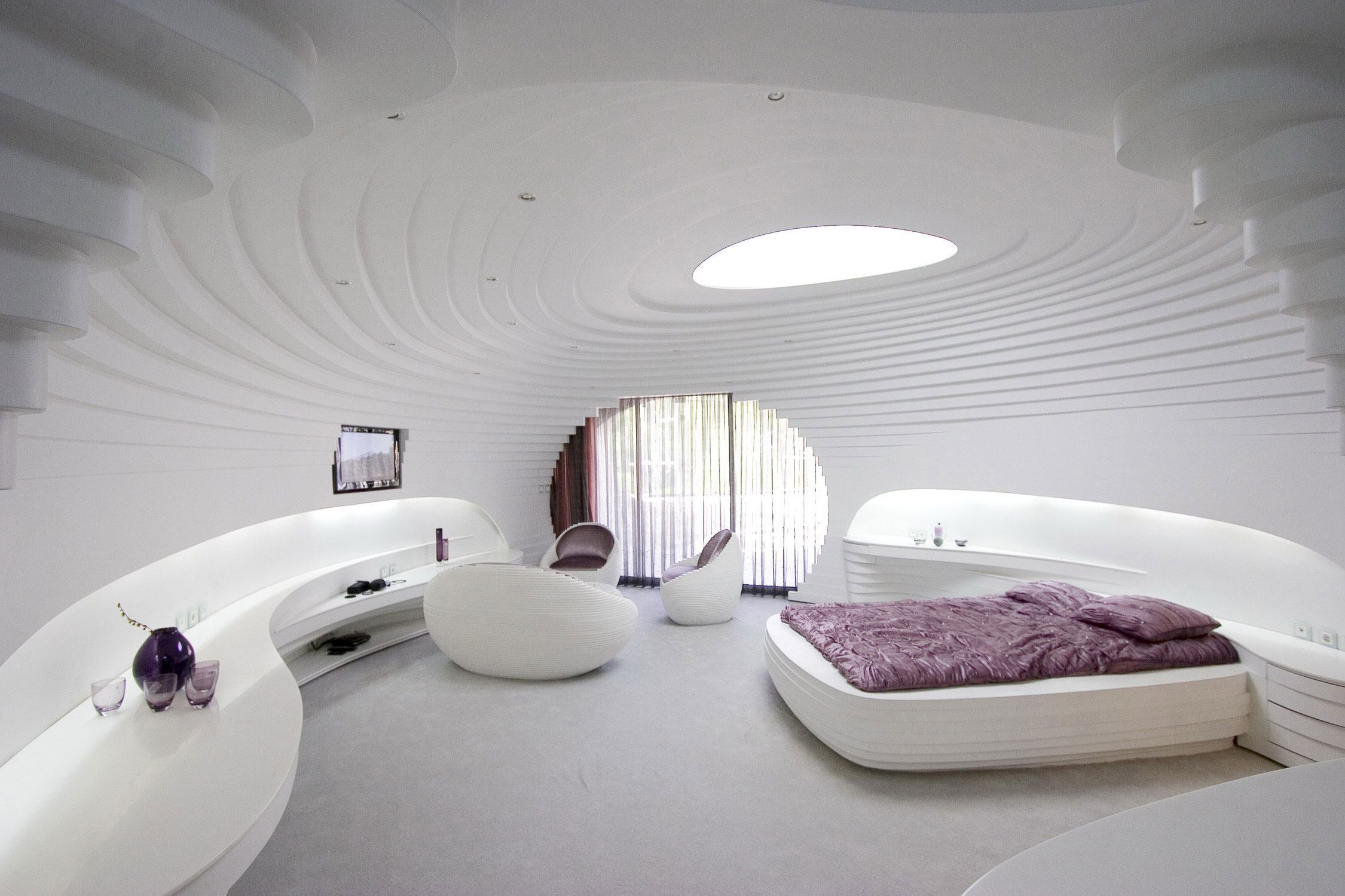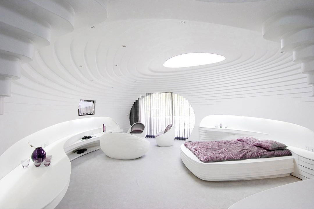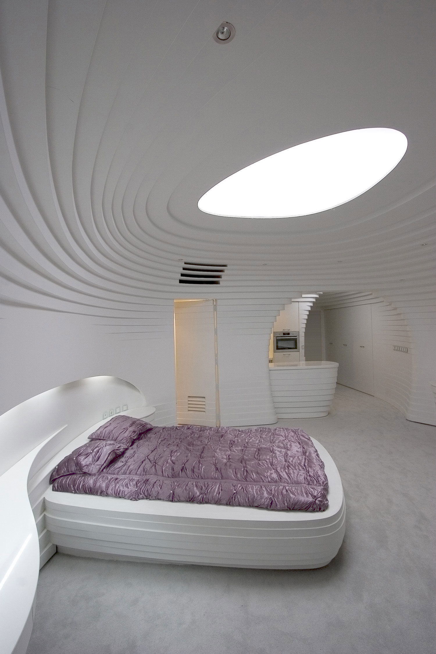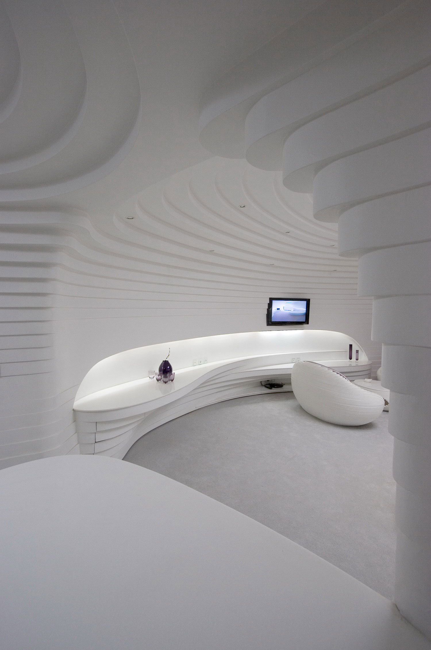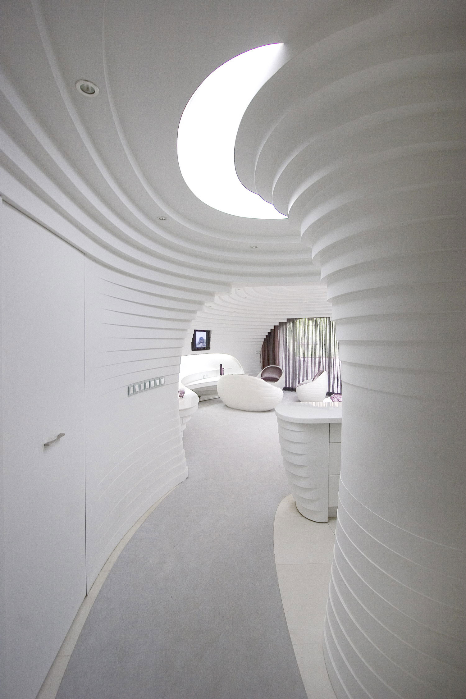 El resultado fue el complejo turístico de esquí de 10 plantas y 67 habitaciones que parece «arrastrado por el viento hasta la ladera de la montaña». Esa metamorfosis es aún más notable en el interior. El diseño de cada una de esas 67 unidades, que van de estudios de 45 m² a áticos de 270 m², hace de ellas cuevas talladas en bloques de hielo. Su forma abovedada, que recuerda a los iglús, se logró técnicamente mediante capas horizontales de planchas de Corian —mezcla homogénea de trihidrato de aluminio y polímeros acrílicos— y MDF —siglas en inglés para Tablero de Fibra de Densidad Media—, cortadas con láser.