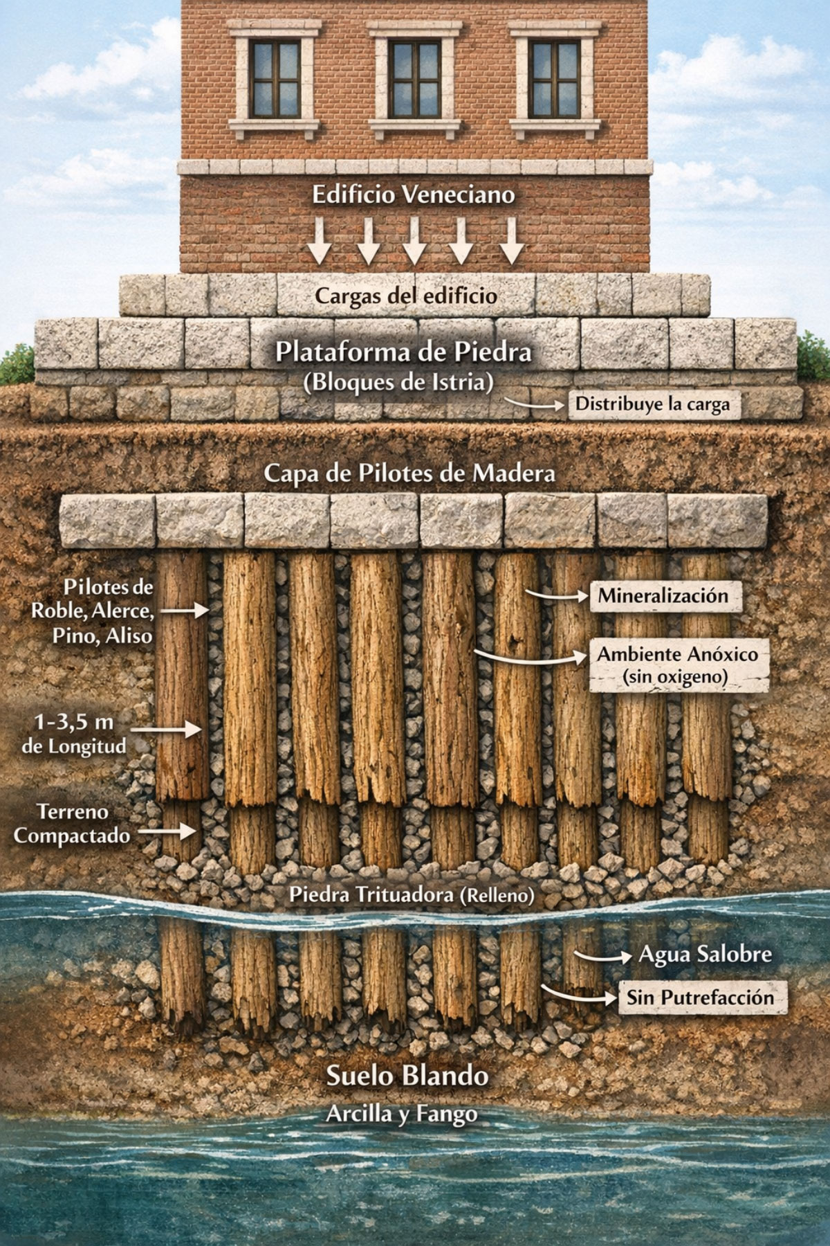En efecto, los edificios más antiguos de dicha ciudad se sustentan sobre pilotes de madera. Sin embargo, su buen funcionamiento se debe en parte a su uso masivo, con miles de ellos bajo los pisos de dichos edificios. Así, los pilotes mejoran las condiciones del terreno superficial, y configuran la plataforma de apoyo sólida y estable que sostiene a la ciudad. Se estima en unos 12.000 los pilotes que sustentan el Puente de Rialto, por ejemplo, mientras que la basílica de Santa Maria della Salute descansaría sobre más de un millón.