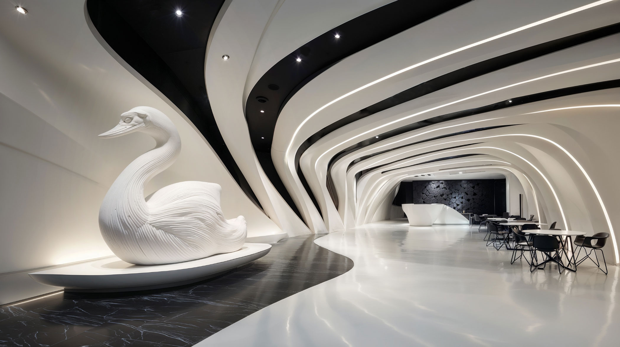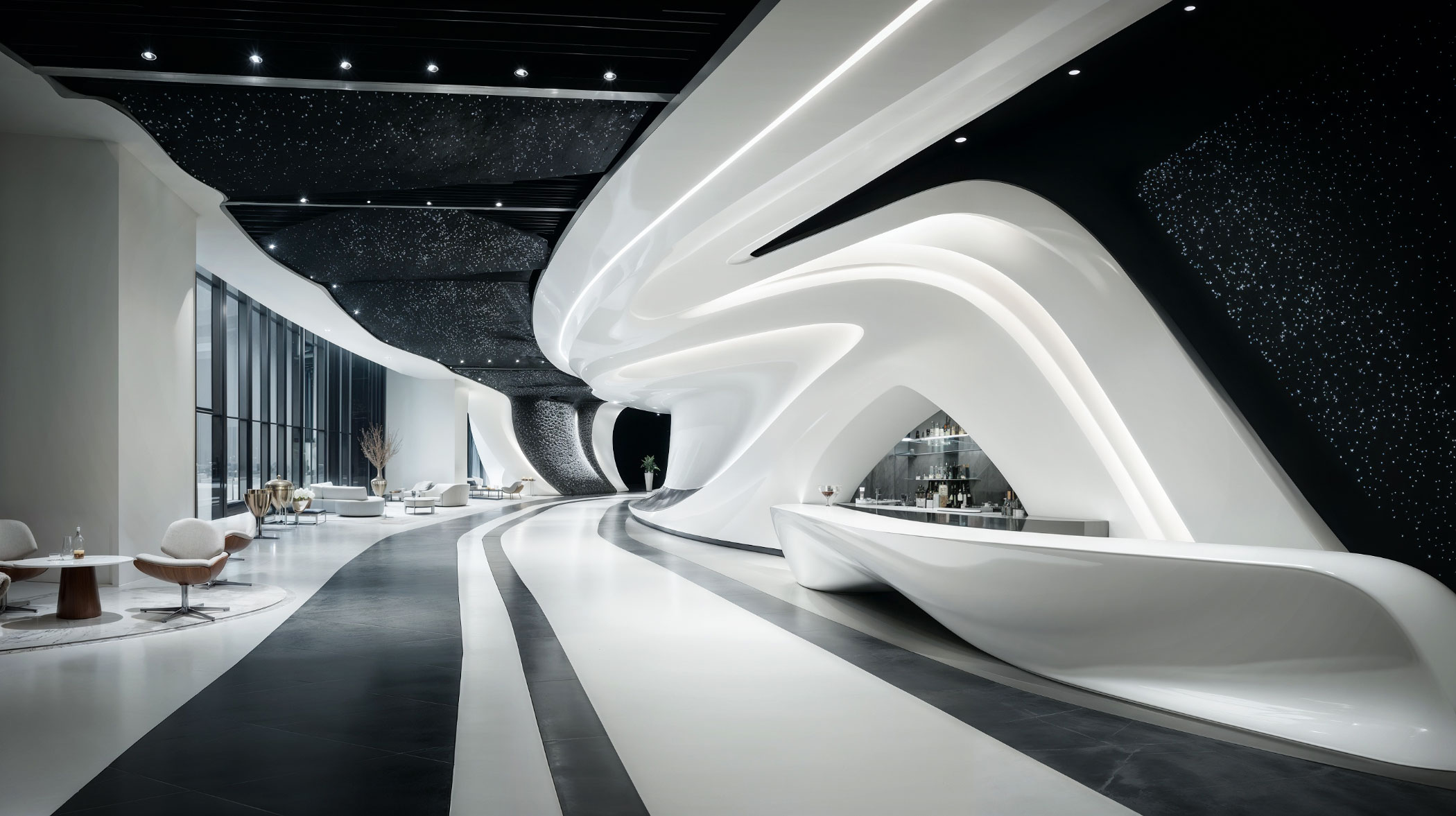 Las estructuras ondulantes que dominan los techos forman esculturas tocadas por una luz que modula el ambiente y guía intuitivamente al visitante por los espacios. Los materiales —lacados y pulidos, táctiles— refuerzan esa sensación de pureza casi celestial y, desde luego, de modernidad. Al fin y al cabo, estos espacios laten como el corazón en hoteles, residencias o tiendas emblemáticas de centros comerciales; la idea es ofrecer una experiencia sensorial antes que comercial.
