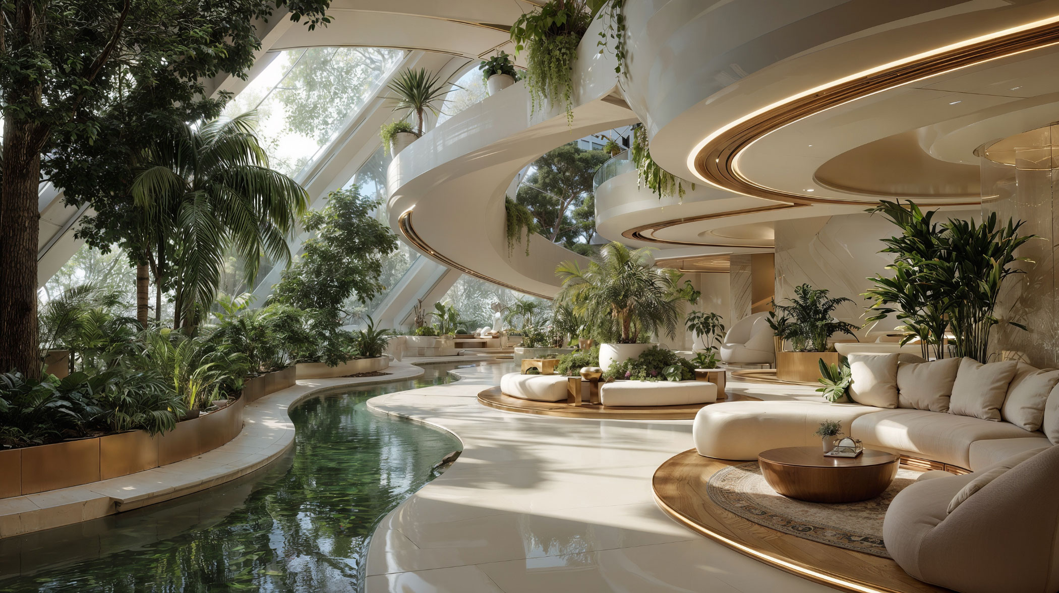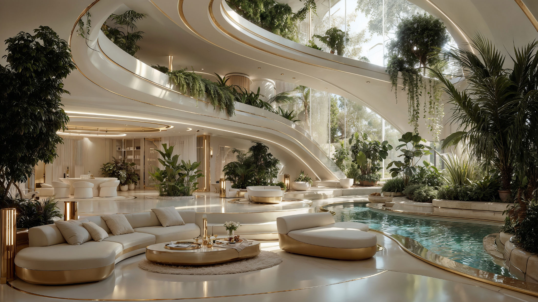 Blancas superficies pulidas y detalles dorados sutiles producen una atmósfera de majestuosa calma. El agua y la vegetación se integran estratégicamente para amplificar la sensación de frescor, serenidad y bienestar. La luz natural se refleja en materiales de extrema calidad y en los acabados de alta artesanía. Todo para transmitir estatus, equilibrio y sofisticación.