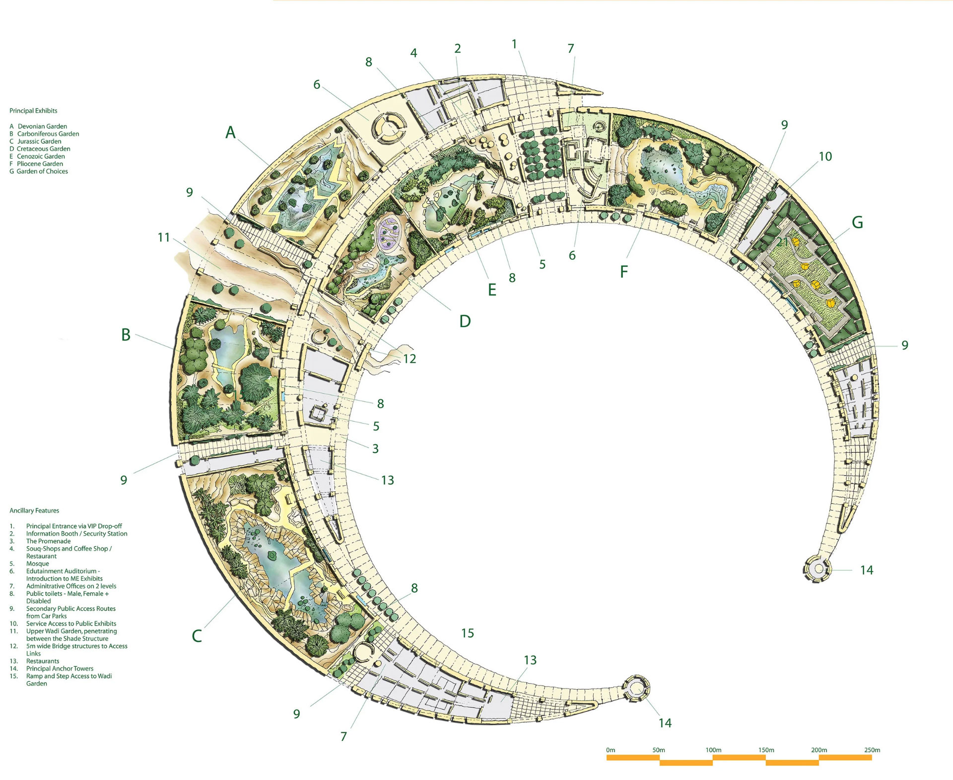 De esa manera, especies vegetales específicas, sobrevivientes de cada período, ofrecerán a los visitantes una experiencia de inmersión que simbolizará un viaje en el tiempo. El recorrido, como una línea temporal que transporta a los visitantes a través de la evolución de la flora terrestre, los llevará del Devónico de hace 400 millones de años, a través de los períodos Carbonífero, Jurásico y Cretácico, hasta la era Cenozoica. La visita concluirá en el «Jardín de las Elecciones» (Garden of Choices), un espacio dedicado a la educación y la reflexión.