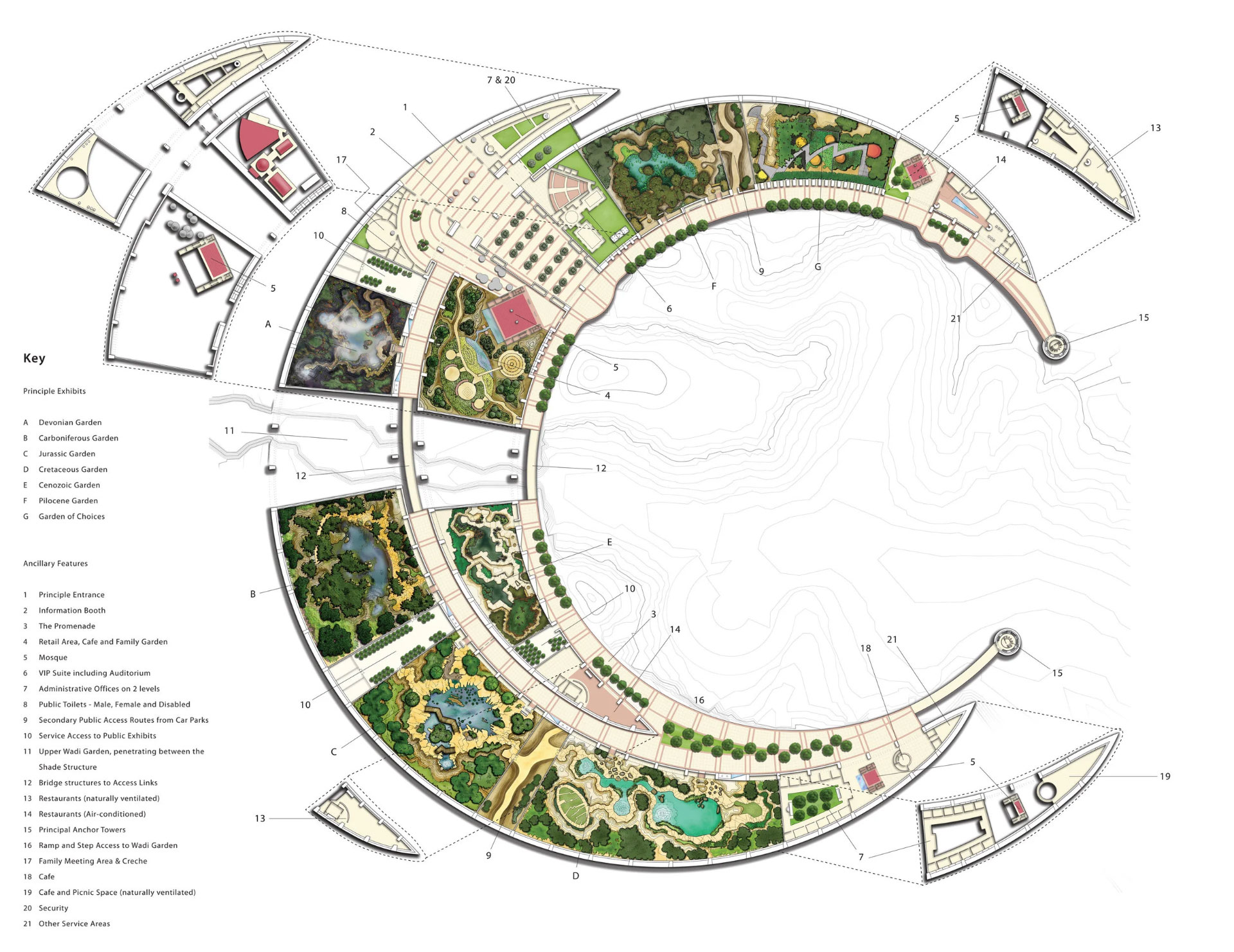 En lo que respecta a su arquitectura, el proyecto consiste en dos gigantescos invernaderos con forma de dos medialunas entrelazadas, con 9 ha de superficie conjuntamente, cada una de las cuales albergará un bioma, es decir, una comunidad ecológica de vegetación y fauna características, determinadas por el clima y la geografía. Sin embargo, el clima y la geografía no serán los únicos elementos determinantes en los Jardines Internacionales Rey Abdullah, sino que el tiempo también adquirirá un carácter especial en cada bioma como hilo conductor de la exhibición. Y es que, en el interior de esas medialunas, se recrearán de manera precisa las condiciones ambientales de distintas eras geológicas.