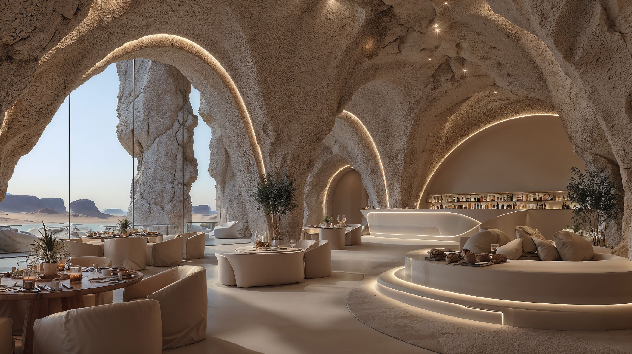 Con este proyecto, el Departamento de Diseño de Amusement Logic explora el concepto de lujo natural a través de una arquitectura que hace de la roca su materia prima. Texturas pétreas, luces cálidas y curvas suaves, producen en los espacios tallados en la roca una atmósfera íntima y sofisticada.