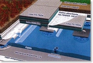 Las cubiertas vegetales reproducen el funcionamiento de un jardín en menos de 30 centímetros de espesor. Uno de los modelos más efectivos es la azotea vegetal ligera con aljibe. Desde el forjado a la superficie, este tipo de instalaciones se compone de diferentes capas aislantes y porosas. Una primera superficie separadora de fieltro de 300 gramos de densidad evita que la parte superior del forjado de hormigón de la vivienda se dañe.