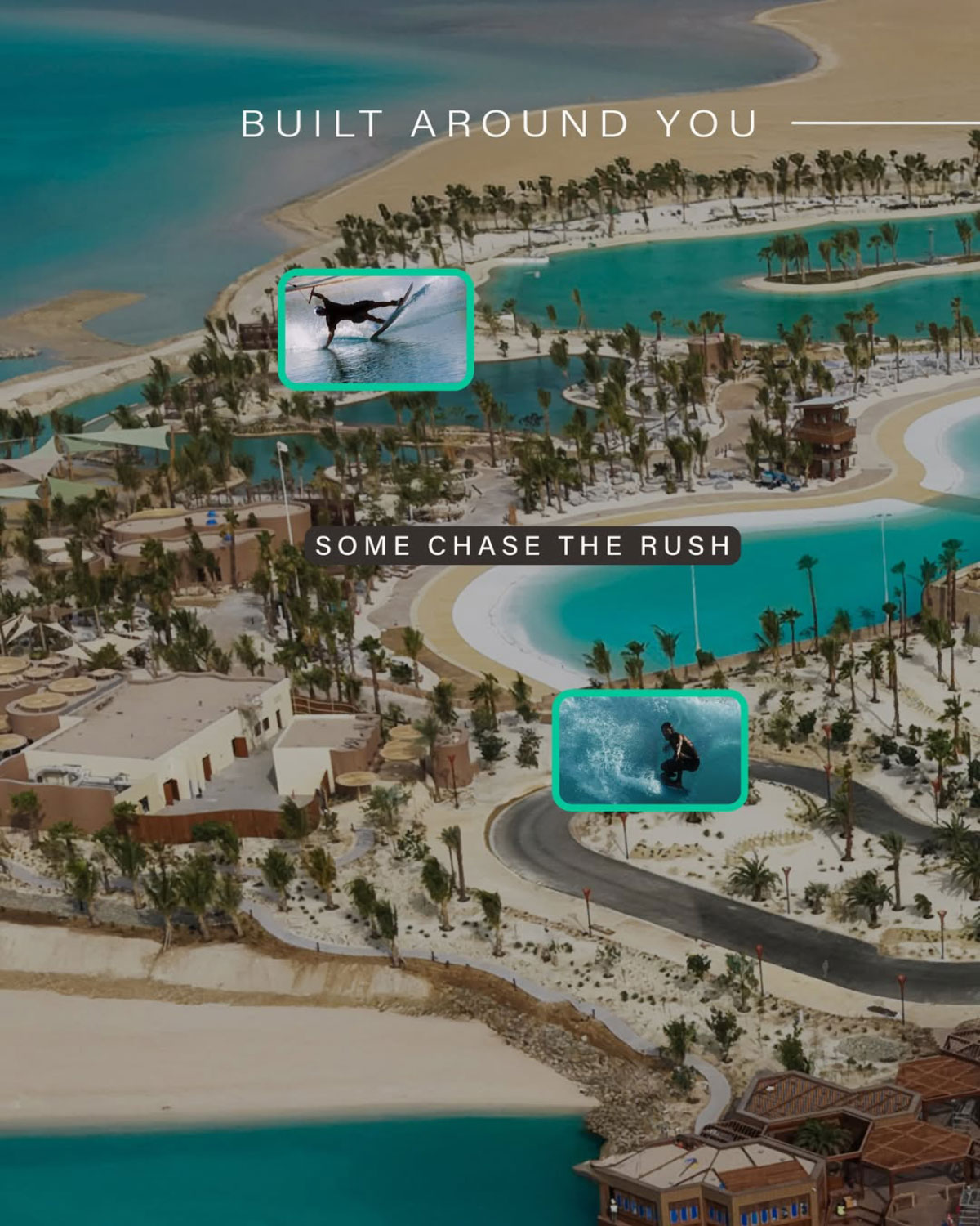 La propuesta combina experiencias terrestres y acuáticas: desde surf, wakeboard y «salto de acantilados», hasta parque de patinaje, pista de BMX —la modalidad de motocross en bicicleta— y una tirolina sobre el agua. Entre sus instalaciones destaca la piscina de surf de agua salada, que con 215 m de longitud, olas de hasta 2,1 m de altura —adaptables a la habilidad del usuario—, es la más grande de Arabia Saudita. También cuenta con una piscina de buceo de 6 m de profundidad, rutas de snorkel y una zona de juegos acuáticos para la familia.