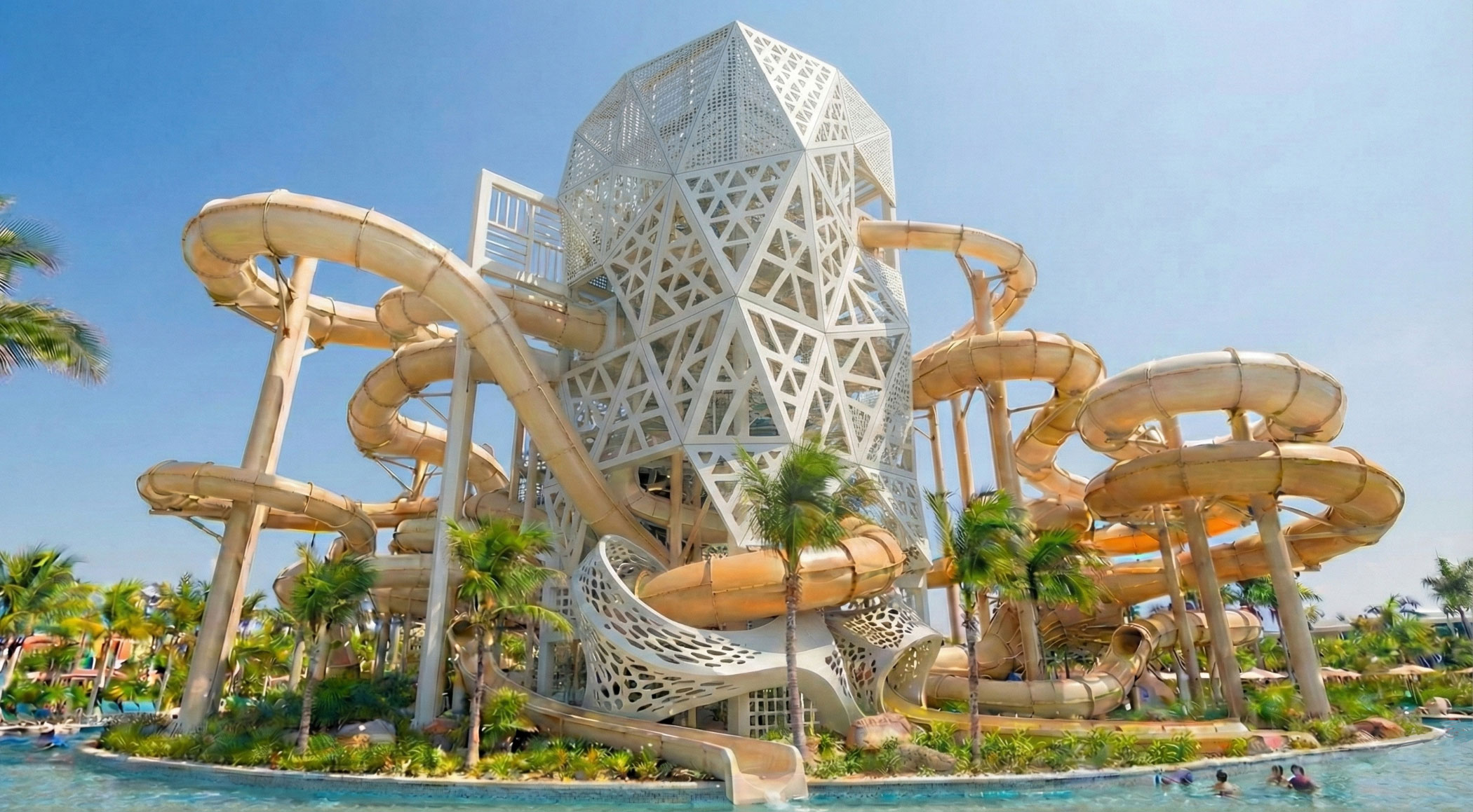 Estructuras envolventes ligeras, modulares y de montaje rápido: una nueva propuesta del Departamento de Diseño de Amusement Logic. Objetivo: dar una nueva vida y una apariencia espectacular a torres de acceso a los toboganes existentes en parques acuáticos. De simples dispositivos funcionales, las escaleras pasan a convertirse en faros visuales y narrativos que distinguen al parque acuático de cualquier otro.