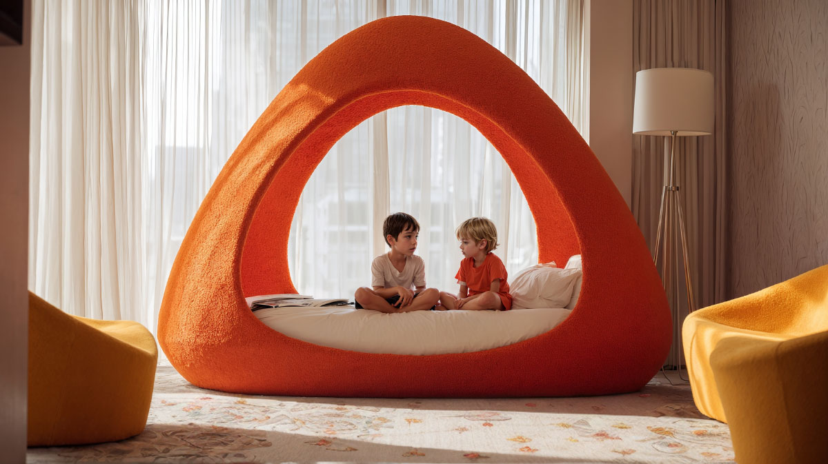 En esta propuesta del Departamento de Diseño de Amusement Logic, el mobiliario infantil se concibe como una pequeña arquitectura dentro de la habitación. Las piezas sirven como refugio acogedor para los niños, donde se sientan, conversan, leen o juegan en intimidad, en un abrazo de formas envolventes, sin aislarse completamente. Se trata de un microespacio propio, un lugar donde la imaginación encuentra un territorio fecundo en sueños.