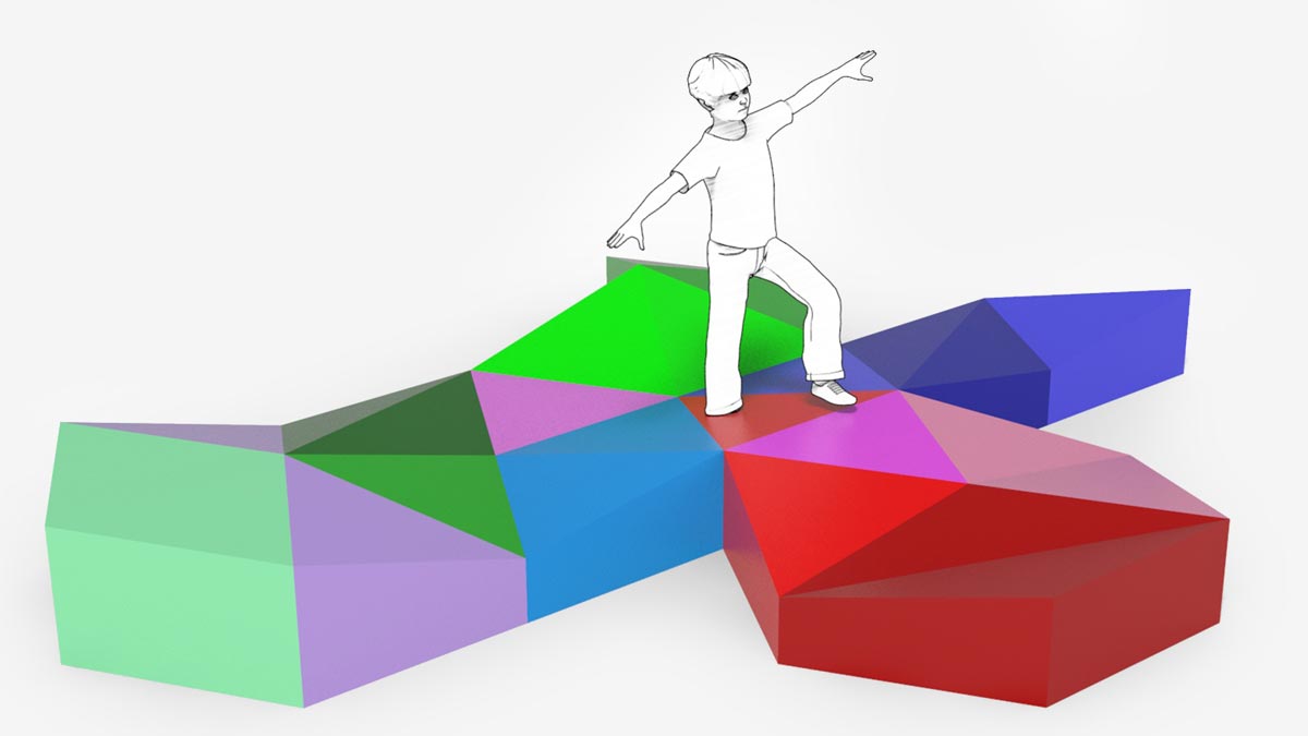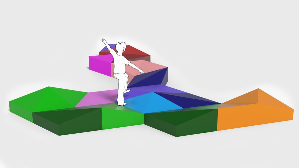 Presentamos como novedad en esta ocasión un juego diseñado para espacios interiores, formado por una serie de volúmenes triangulares acolchados y de vivos colores. Se trata de un puzzle cuyas piezas permiten a los más pequeños crear una topografía a su medida, de tamaño y forma personalizable.